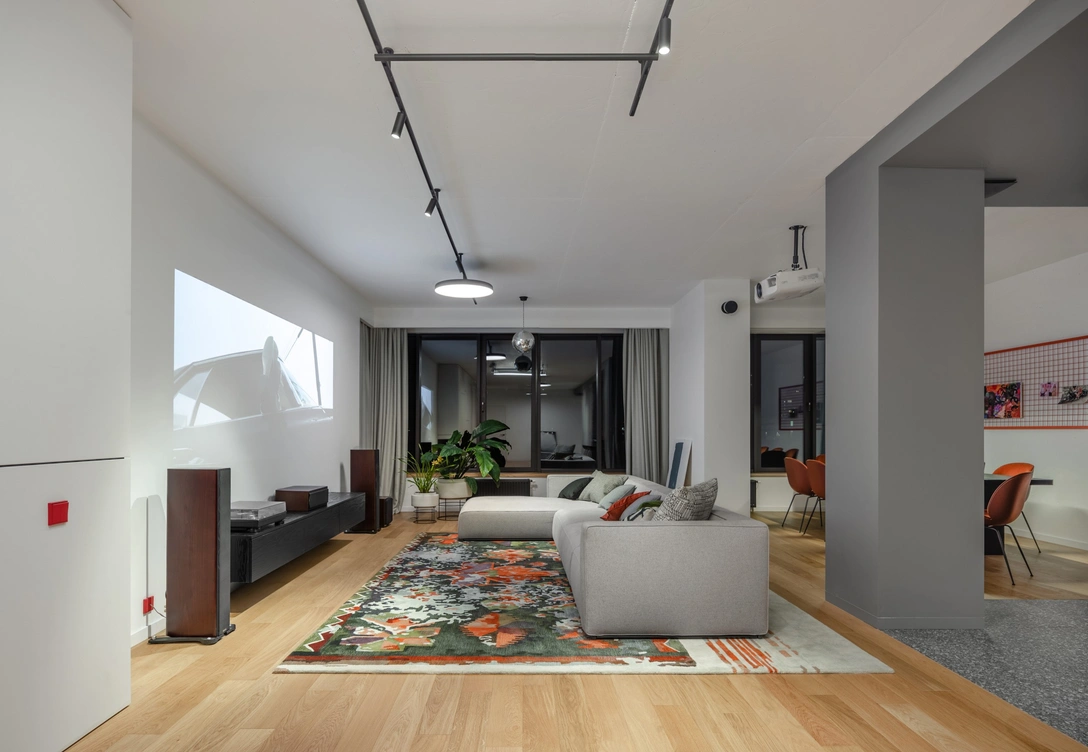 «Заказчики — семья с тремя детьми и собакой, изначально мечтали о лофте. Дословно пожелание было таким „Нам нужен интерьер, в котором мы будем счастливы не на показ“. А еще был запрос на место для детских игр и взрослых тусовок. В итоге здесь можно ездить на самокатах, играть в футбол и устраивать вечеринки на сто человек».