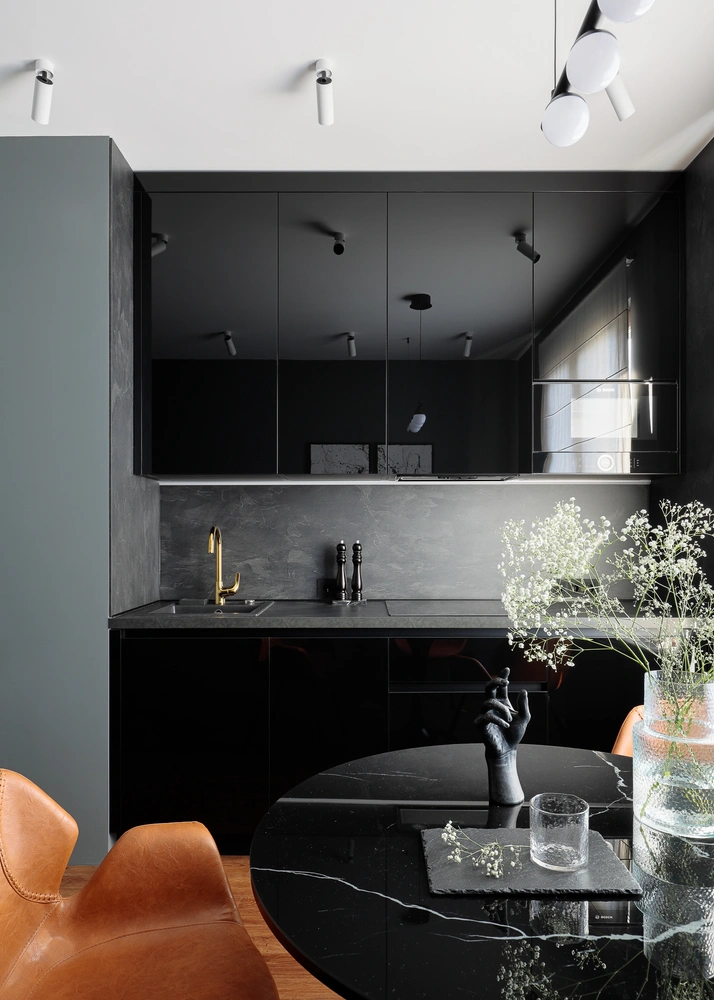 «Компактная и минималистичная столовая зона дополнена оранжевыми стульями, которые перекликаются с цветом изголовья кровати и создают визуальную связь между пространством кухни-столовой и спальни. Кухня получилась небольшой, но несмотря на это, в ней есть все необходимое, чтобы сварить кофе с утра или приготовить обед».