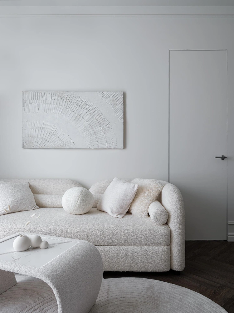 В гостиной разместился бежевый диван, который можно разложить. Его дополняет журнальный столик, повторяющий его форму и текстуру ткани букле.
