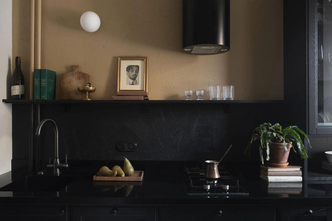 «Квартира находится в доме 1957 года. В 1990-е кухню сделали проходной, а гостиная и спальня были единым помещением без явного зонирования. Мы же решили вернуть прежнюю планировку с отдельной кухней, коридором и большой комнатой, в которой расположилась темная спальня-альков за тяжелой бархатной шторой и светлая гостиная с камином и книжными полками. Хоть зоны фактически остались на прежних местах, такое деление цветом помогло хозяевам избавиться от ощущения „спальни, в которой стоит диван“».