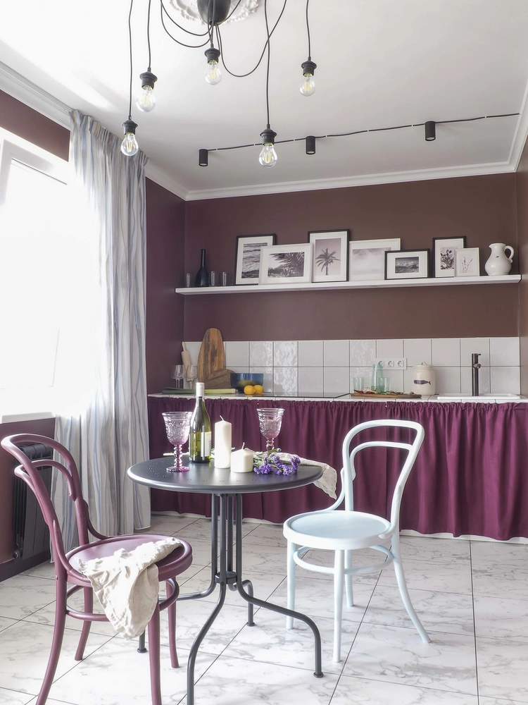 «Несмотря на демонтаж перегородки между кухней и гостиной, кухня визуально отделена от основной зоны, так как расположена в нише. Здесь стоит маленький круглый столик — как в типичном парижском кафе, где можно часами сидеть с друзьями, наслаждаясь хрустящим багетом, сыром и непринужденной беседой. На кухне не будут постоянно готовить, поэтому все сделано просто: вся бытовая техника спрятана в нишу со скрытыми дверями. Фартук и столешница выполнены из винтажной плитки, как раз в духе Франции».