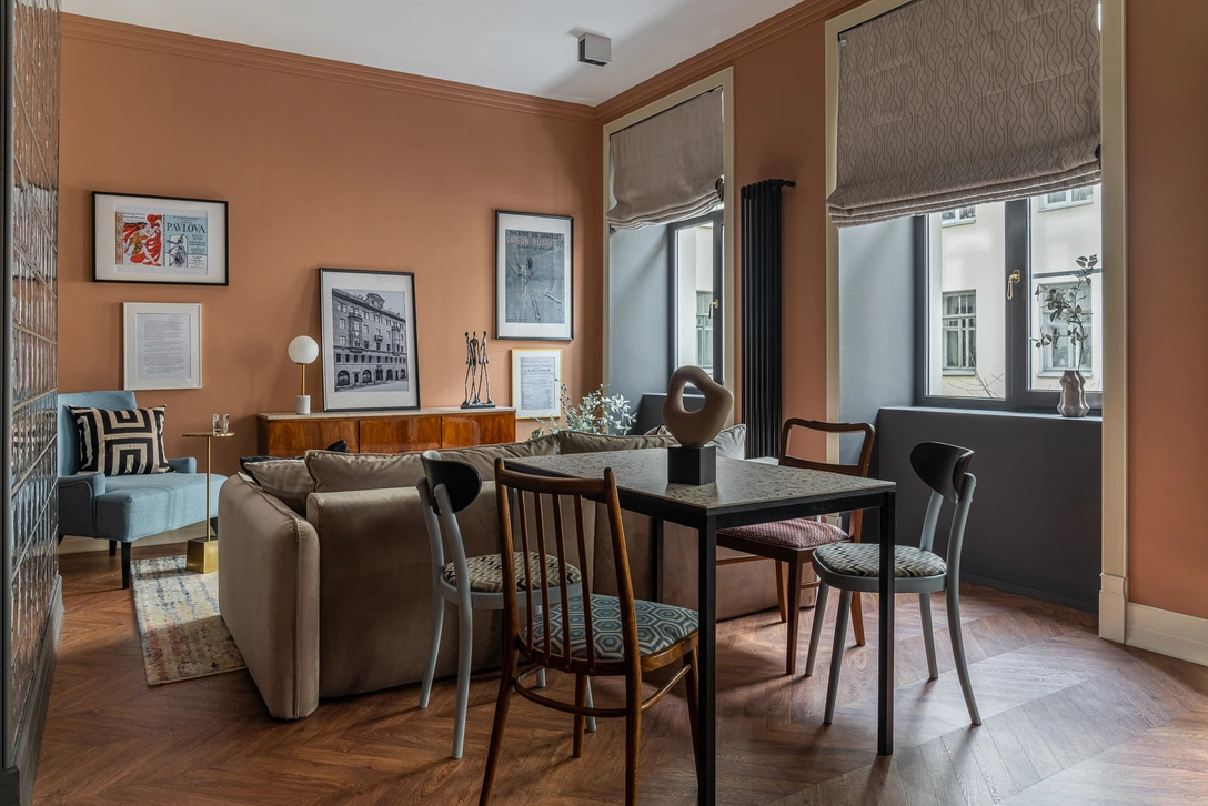 «Здание было построено в 1909 году. Несколько лет здесь жили известные деятели балета, в том числе Агриппина Ваганова, поэтому одну из стен мы украсили ретро-афишами балетных выступлений. Оформление оконных порталов отсылает к традиционным интерьерам начала XX века, стеклоблоки, винтажные комод и стулья — к стилю mid-century, а диван, кровать и кресло отличаются лаконичными современными формами».