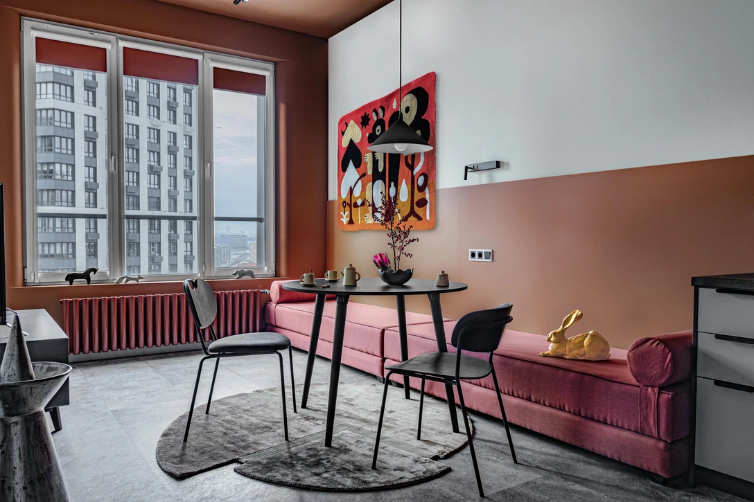 Фишкой проекта стала эффектная отделка: сочетание белой и терракотовой краски задает смелое и бунтарское настроение. При выборе напольного покрытия дизайнер решил отказаться от привычного паркета в пользу кварцвинила с имитацией натурального сланца.