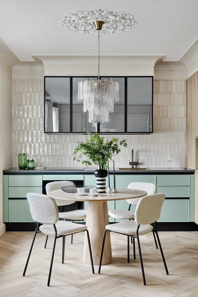Весь интерьер выдержан в благородной серо-бежевой гамме. Главным цветовым акцентом стала кухня с мятными фасадами. На их фоне расположился дубовый стол, который задумывался как место встречи многочисленных друзей и родных заказчицы. Его дополняют лаконичные «икеевские» стулья с фактурной обивкой и ярусная люстра, переливающаяся в солнечных лучах.