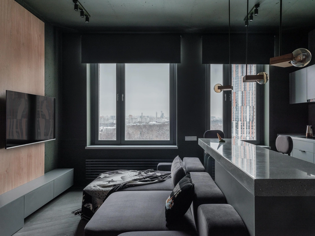 Заказчик сразу предупредил архитекторов, что готов к экспериментам, и команда Kovalev & Partners решила его не разочаровывать. Квартира была сдана в бетоне, его частично оставили как есть, но местами покрасили — цветовое решение основано на контрасте темно-зеленого оттенка с серо-бежевым и цветом натурального дерева. Один из часто встречающихся в интерьерных изданиях заголовков — «как сделать серый интерьер нескучным?» Вот так, например. Сделать его не ровным и спокойным, а брутальным, добавив бетон и доски.