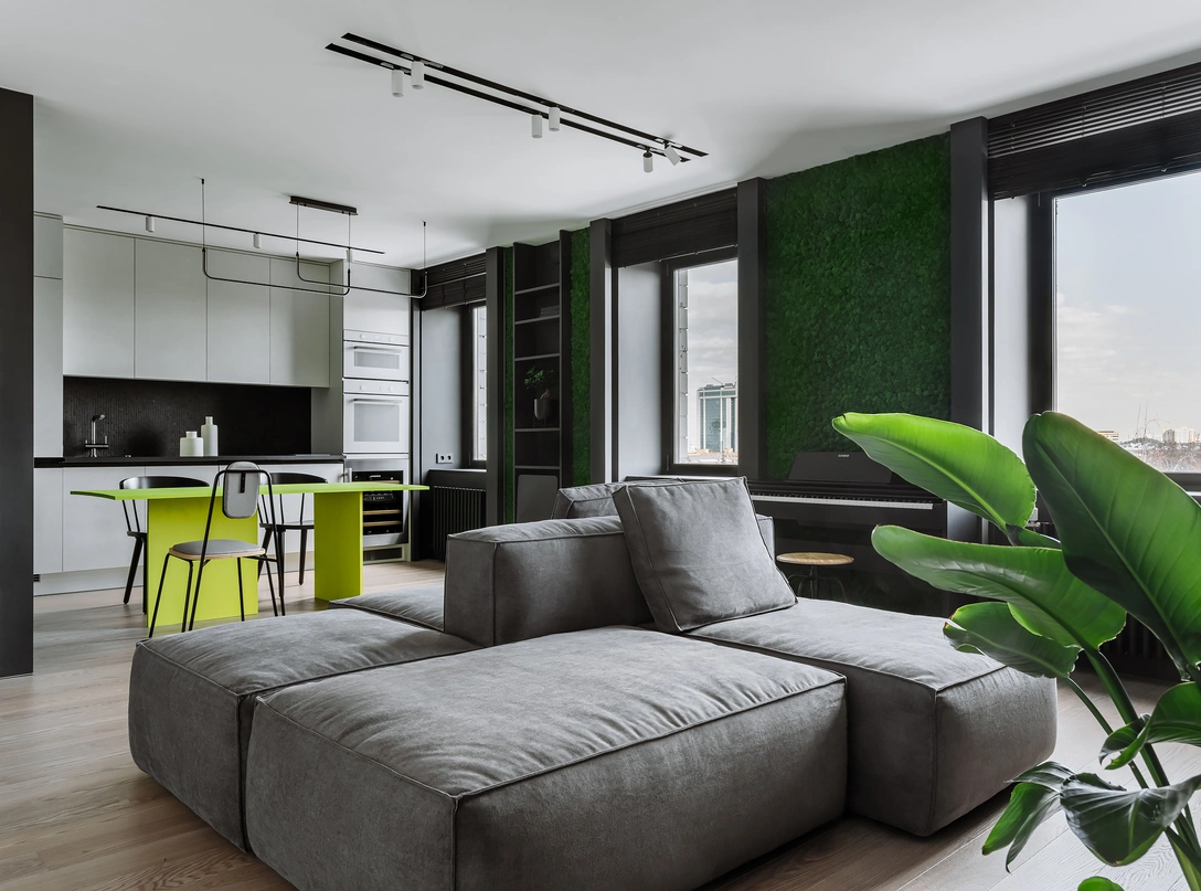 Главной темой в гостиной стали панорамные виды на город и живые зелёные стены. Все остальное работает как фон и функция, за исключением нескольких ярких декоративных акцентов.