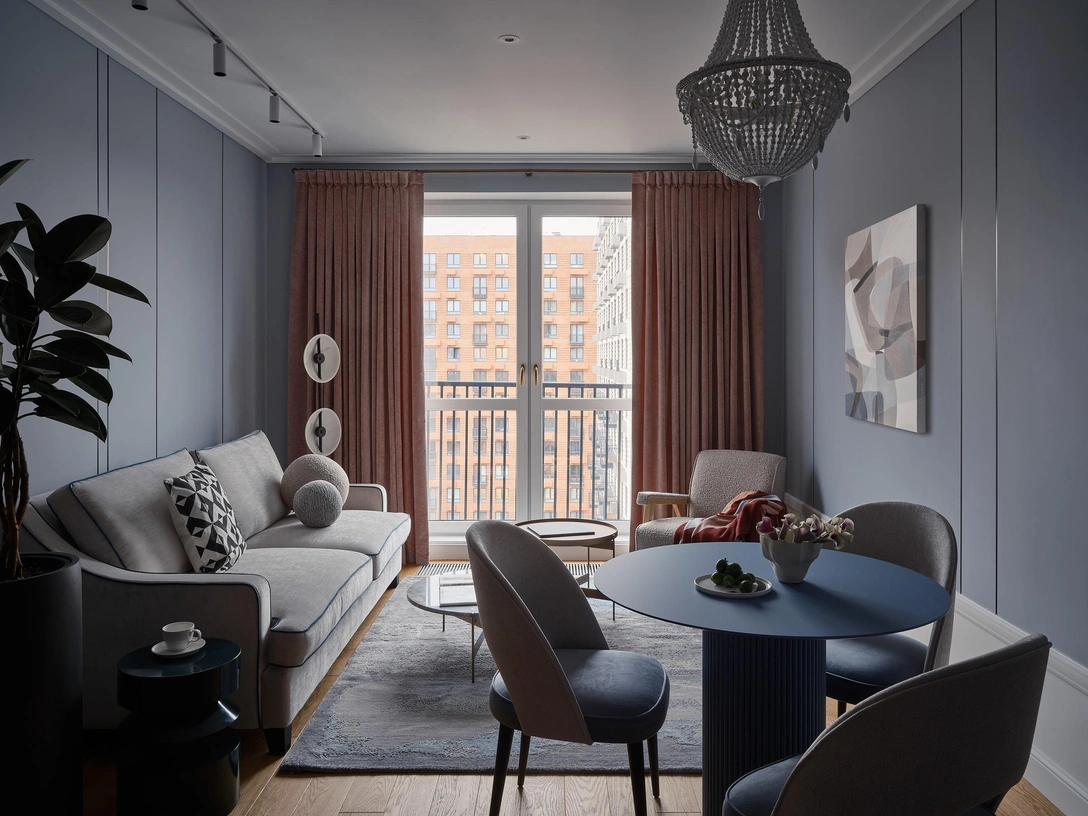 «Заказчица — молодая творческая девушка-блогер. В интерьере ей хотелось уйти от серости и бежевости, добавить больше цвета и уюта. Одной из главных просьб было организовать отдельный кабинет с библиотекой, креслом и письменным столом для написания стихов и песен. В связи с этим мы сразу отказались от расширения кухни-гостиной. Но, чтобы зрительно увеличить ее и всю квартиру, сквозной проход из прихожей мы намерено оставили без дверей», — рассказывает автор проекта.