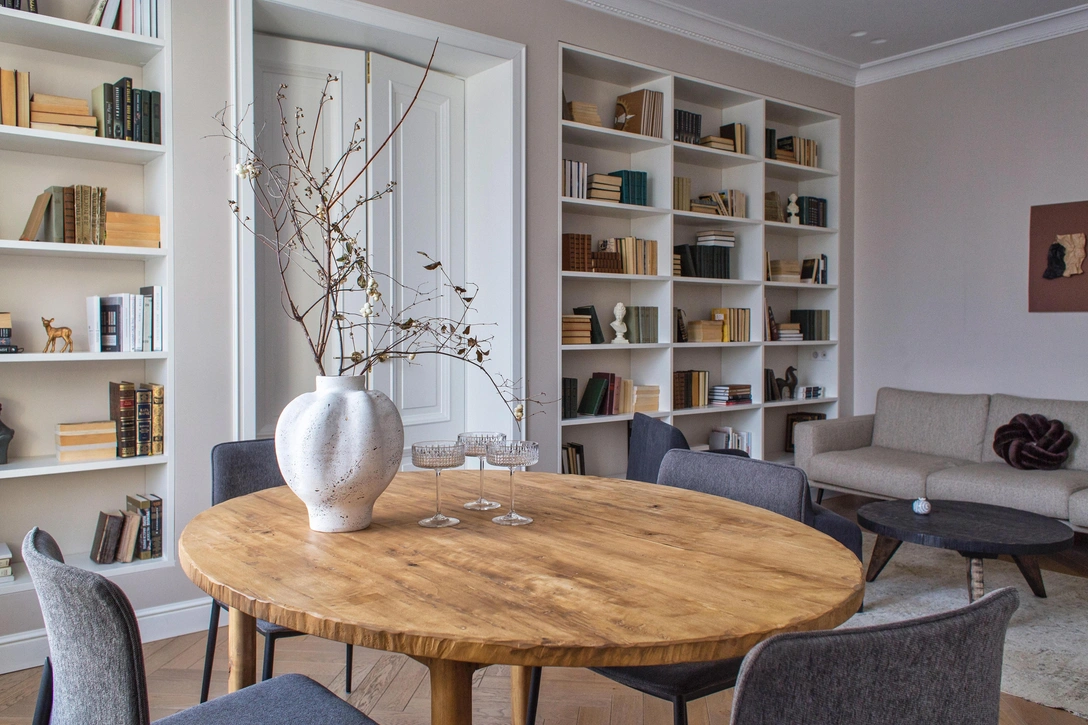 У заказчицы большая коллекция книг, которой нужно было найти место. Я запланировала встроенные стеллажи по бокам от анфиладных дверей. Мы трижды меняли их размер — хозяйка переживала, что книги не влезут, или наоборот, полки окажутся слишком большими. Но в итоге все получилось идеально.