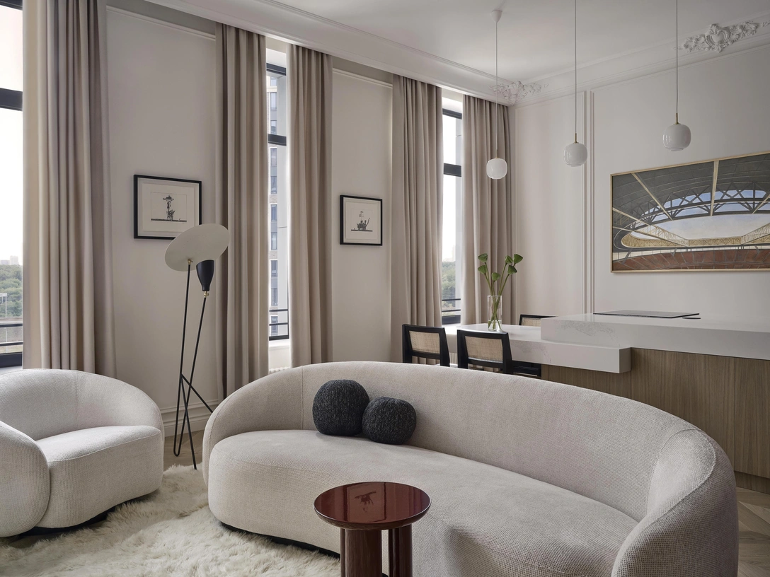 «Хозяева квартиры, пара среднего возраста, не хотели отдельную кухню и стандартный кухонный гарнитур, — рассказывает автор проекта, — в итоге получилось, что кухня и гостиная — это фактически одна общая зона, самая большая по площади в квартире».