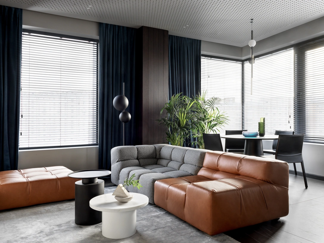 «Интерьер выстроен на контрастах: светлые стены и темный каменный пол; жалюзи на окнах и паттерн кругов на потолке; лаконичная, силуэтная обеденная зона с круглым столом и яркая зона ТВ с кожаными и принтованными модулями дивана. Кухня в проекте супер архитектурная и лаконичная. Она тоже выстроена на контрастах: вертикальные объемы в темном дереве, горизонтальные в светло-сером композите».