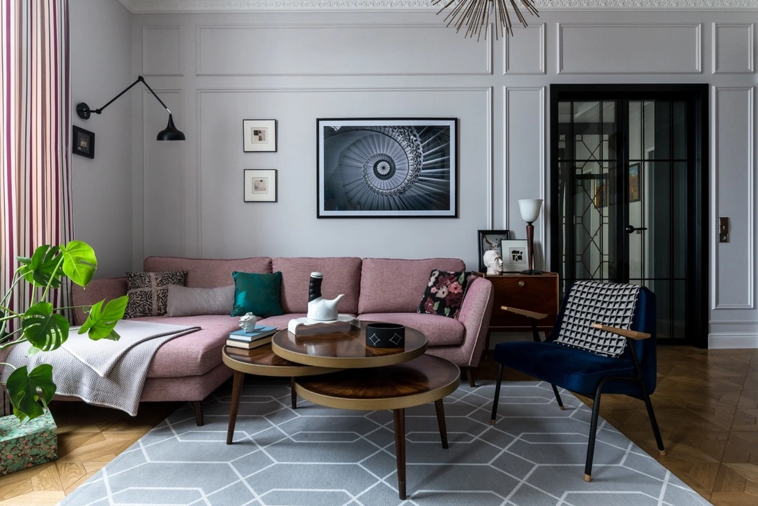 «Самым важным этапом перепланировки стала организация кругового движения. Прямо от парадного портала в прихожей вы попадаете в сквозной проход на кухню, выходите к круглому обеденному столу, далее — в гостиную — в спальню, и так по кругу. Кстати, заказчики сначала не очень поняли это ход, но теперь очень рады, так как это решение создает ощущение большого пространства».
