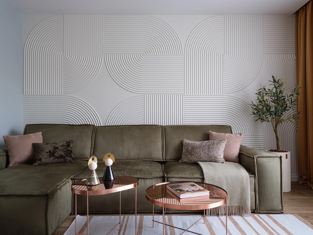 Интерьер выполнен в спокойной палитре с добавлением охристых, розовых и оливковых оттенков. Цветовые акценты переходят из комнаты в комнату, визуально объединяя пространство. К примеру, в цвете охры выполнены портьеры в гостиной, стулья в кухне и пуф в прихожей, а в теплый зеленый оттенок мы выкрасили стену за изголовьем кровати в спальне и стену у входа в квартиру.
