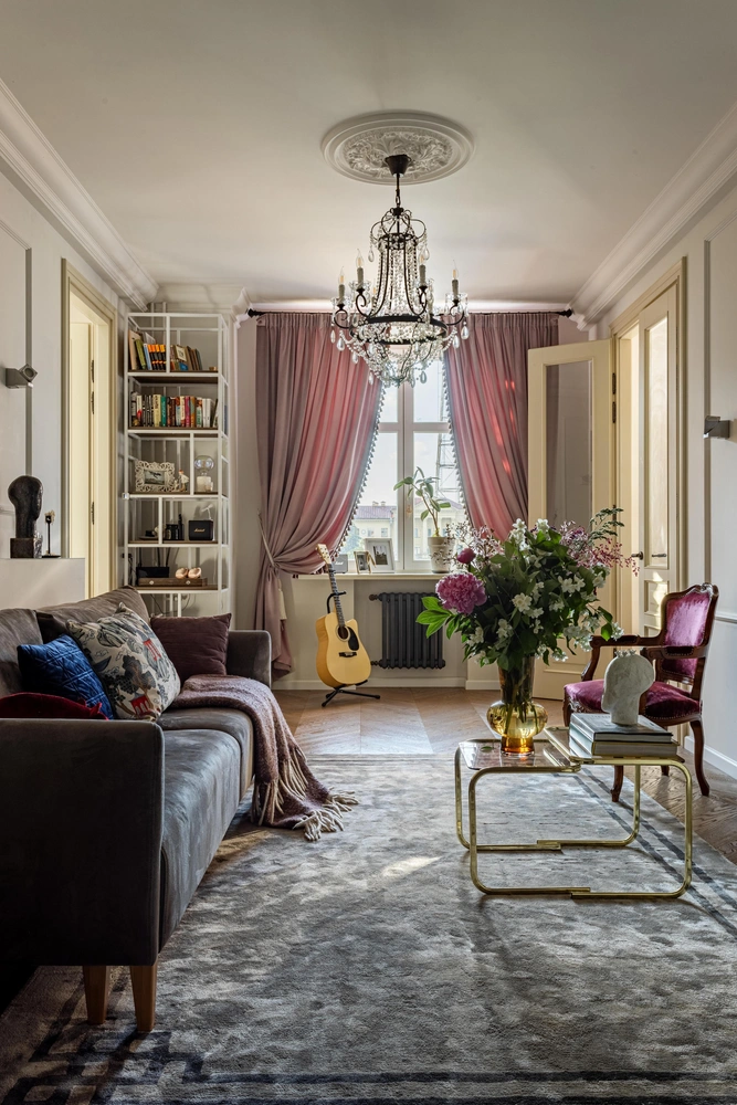 «Квартира находится в сталинке с великолепными колоннами и лепными украшениями, расположенной рядом с Парком им. Максима Горького и Большим театром оперы и балета. Здание было построено в 1952 году по проекту московского архитектора Михаила Барща, который приехал в послевоенный Минск для его восстановления. Во время своего визита он жил именно в этой квартире, которой я спустя более полувека подарила новую жизнь», — рассказывает дизайнер.