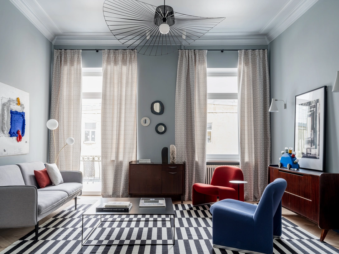 «Стиль навеян самой архитектурой дома, историческим прошлым квартиры и ее прежних владельцев. Мы лишь добавили модернистское настроение и яркий цвет, сделали интерьер более свежим и актуальным. Создали интерьер, который хочется разглядывать и изучать, но который при этом не выйдет из моды», — рассказывает дизайнер Юлия Калашникова.