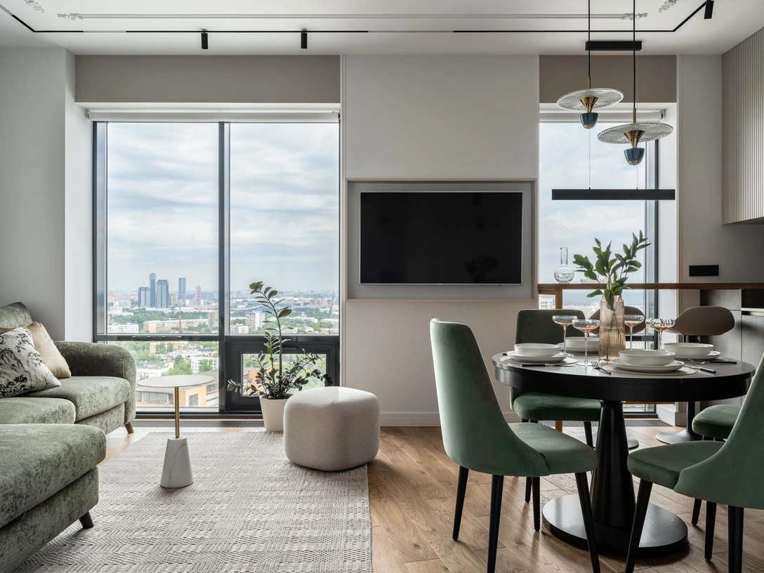 Войдя в кухню-гостиную, вы словно попадаете в лесную сказку — над диваном висит фактурное панно с изображением елок, написанное художницей специально для этого проекта. Оно вступает в диалог с зеленым пейзажем, открывающемся из панорамных окон.