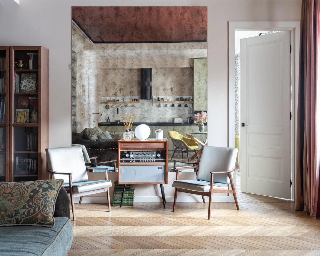 Гостиная просматривается еще из прихожей, отделенной перегородкой стеклоблоками. Мозаика на полу при входе перекликается с мозаикой в зоне кухни и зеленым оттенком обивки дивана, который дополнен жаккардовыми подушками. Достойную партию ему составили винтажные кресла, «переодетые» в шелк и бархат. Рядом с ними расположилось состаренное зеркало. В нем отражается все пространство кухни-гостиной, но в каком-то преломленном виде, как будто оно уводит нас в прошлое этой квартиры.