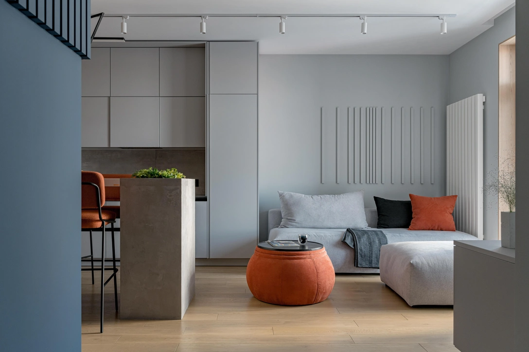 Цветовая гамма: монохромный серый в сочетании с деревом, в качестве акцентов синий и оранжевый