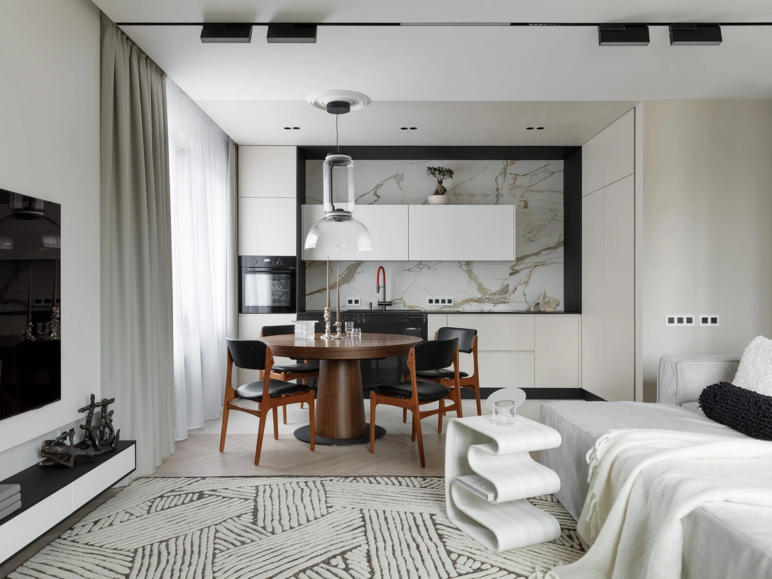 «За счет грамотного планирования нам удалось разместить все функциональные зоны, необходимые для комфортной жизни, а благодаря продуманному дизайну — создать ощущение простора при общей площади квартиры всего 82 кв.м. и чистовой высоте потолков 2,6 м».