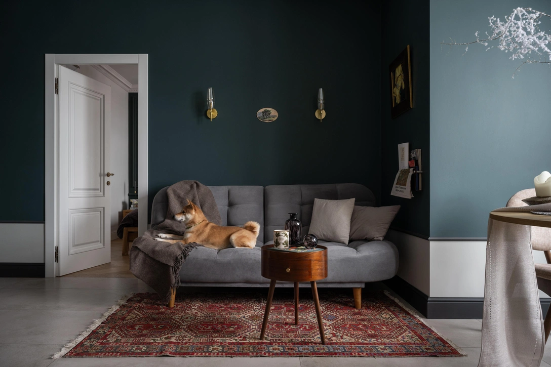 Отделка стен гипсовыми молдингами и лепные розетки на потолке придают интерьеру черты французского стиля. А смелое сочетание сложных насыщенных оттенков глубокого изумрудного и цвета северного моря с добавлением натурального ореха и латуни в отделке делает пространство обволакивающим и камерным, и в то же время драматичным.