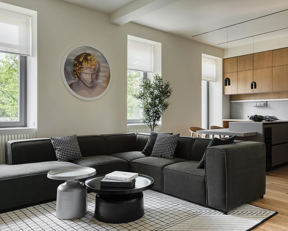 Владельцы квартиры — семейная пара с двумя собаками породы джек-рассел-терьер. Интерьер они доверили своей близкой подруге, дизайнеру Ольге Зубаревой. «Ребята попросили создать современное гармоничное пространство с текстурами дерева, камня и бетона в отделке, — рассказывает автор проекта. — Было важно использовать каждый метр площади, предусмотреть большое количество мест хранения и в то же время сохранить ощущение простора».