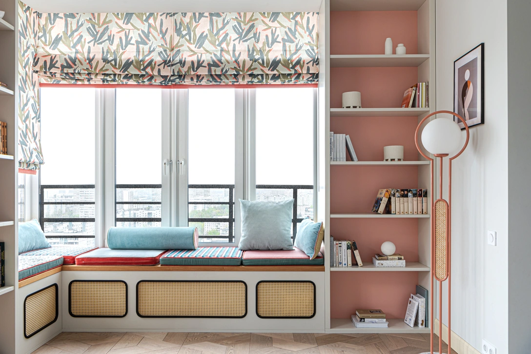 Текстиль в этом проекте мы выбирали не в конце, а в начале работы. Это отличный прием — хороший текстиль задает богатую цветовую гамму. Сочетания разных фактур, рисунков и цвета мы подбирали не только для портьер и римских штор, но и для покрывал, пледов, подушек, изголовья кровати, матрасиков для подоконников и даже для потолочного светильника в спальне, который мы обтянули тканями-компаньонами и обшили бахромой со стеклярусом.