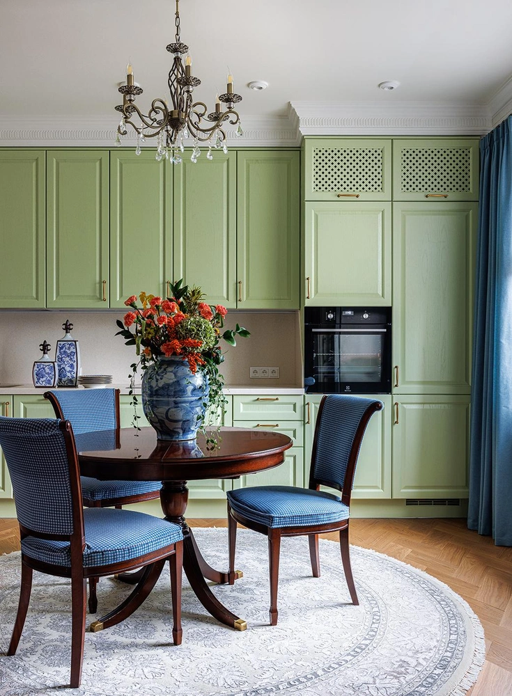 «Прошлая хозяйка квартиры оставила большое количество качественной деревянной мебели. Кое-что мы смогли использовать в нашем проекте. Так, например, обеденная группа нашла свое место в новом интерьере, мы только перетянули стулья в нужную нам ткань. Кресла в гостиной и спальне, а также пара люстр тоже остались от прошлой хозяйки».