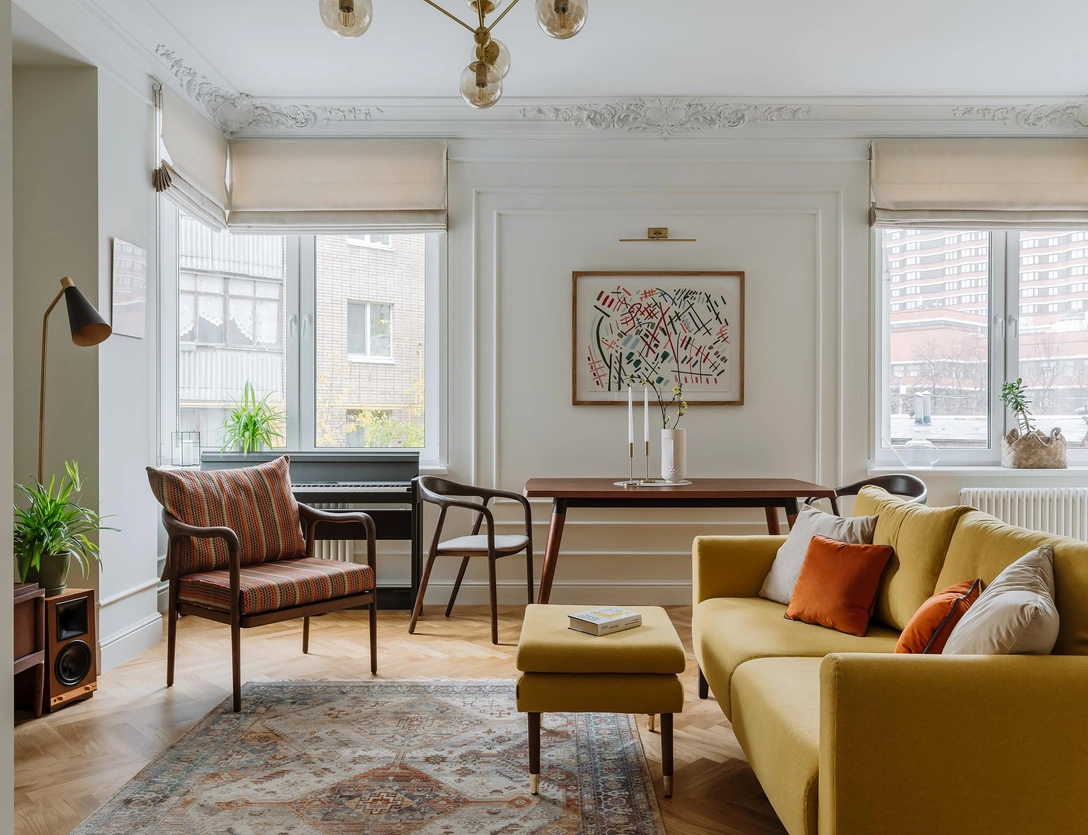 Интерьер этой московской квартиры создавался для молодой семейной пары с ребенком. Прежде всего заказчики попросили использовать в отделке классические элементы и «живые» материалы, такие как дерево и гипс. Стены непременно должны были быть белыми, пол — паркетным, а мебель — легкой и удобной, в духе 1960-70-х годов. Еще в квартире нужно было найти место для картин, книг и музыкальных инструментов.