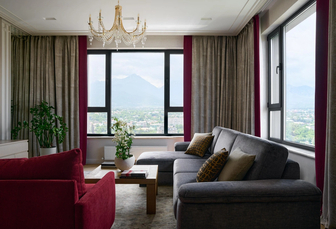 «В гостиной был большой короб с вентиляционными шахтами — эту стену мы выровняли книжными шкафами и рабочим местом. Пространство украсила гипсовая лепнина с подсветкой, выполненная по моим эскизам, и шикарный вид из окна. Принт на шторе, кстати, печатали под наш интерьер — с похожими на лепнину узорами».