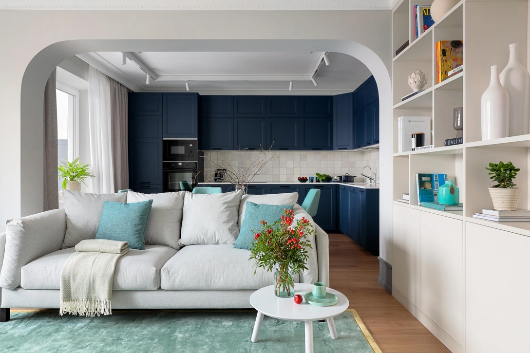 «Кухню и гостиную сразу решили объединить. Для этого мы использовали изящную французскую арку. Ее плавные изгибы повторяются в облике люстры, разместившейся над диваном, а также в изогнутых линиях потолка в прихожей и полукруглых зеркалах в мастер-ванной и спальне».
