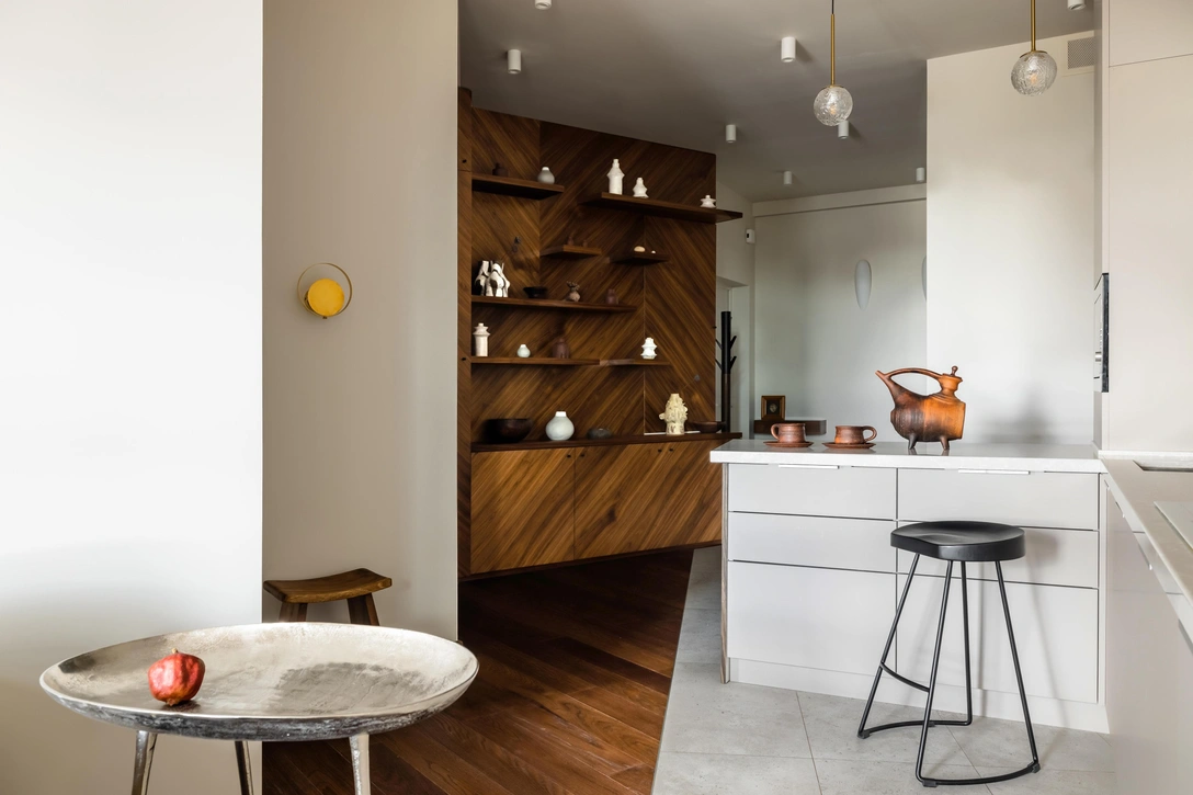 Пространство закручивается вокруг центрального элемента, который объединяет и одновременно разъединяет две автономные зоны для двух поколений — каждая со своей спальней и ванной комнатой. Частью этого магического элемента является кухонный блок с выступающей барной стойкой, которая отделяет кухню от прихожей.
