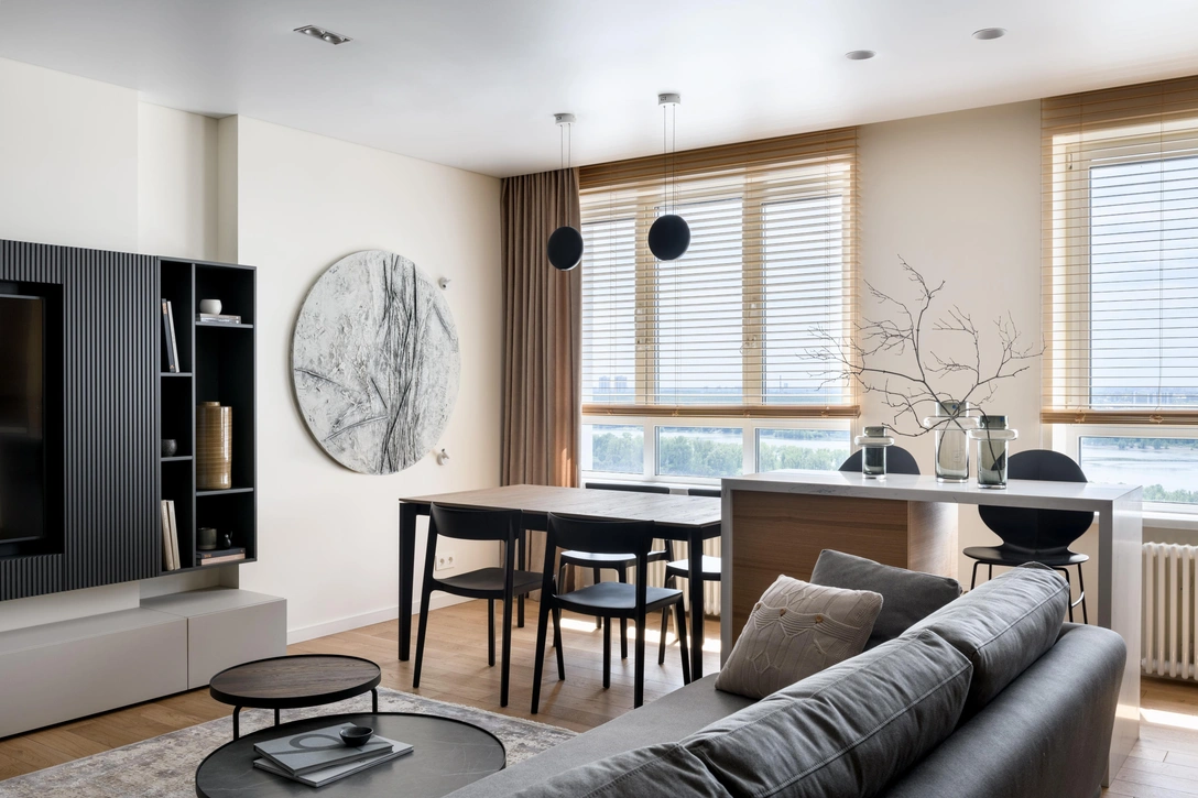 «Интерьер этой квартиры создавался для молодой семейной пары, которая на момент начала ремонта ждала первенца. Оба супруга работают из дома, поэтому главным пожеланием было организовать отдельный кабинет, — рассказывает дизайнер Екатерина Плотникова. — Разрабатывая дизайн-проект, мы вдохновлялись видом на Обь, который открывается почти из всех окон квартиры. Нам хотелось, чтобы интерьер стал его продолжением, отражая то, как меняется пейзаж в разное время года».