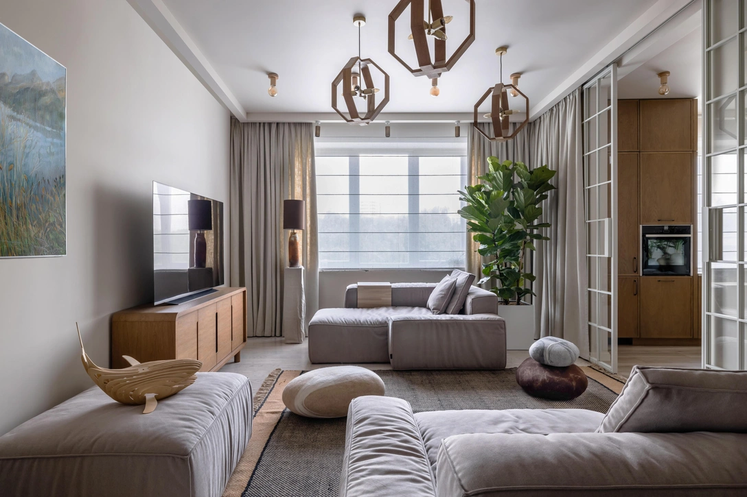 Чтобы создать обволакивающую атмосферу, для стен мы выбрали мягкий серо-бежевый оттенок. Тот же цвет использовали в отделке раздвижных стеклянных перегородок и межкомнатных дверей из массива ольхи, и даже гардины подобрали в тон стенам.