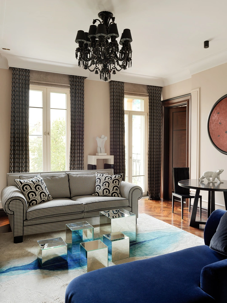 Квартира находится в доме 1910 года, расположившемся во дворах Трубниковского переулка. В основе дизайна лежит архитектурный стиль самого здания — ранний модерн. Я решила создать эклектичное сочетание классической планировки с анфиладой вдоль окон и современных предметов мебели и искусства. Лепной декор стен был разработан специально для этого проекта, чтобы подчеркнуть высоту потолков.
