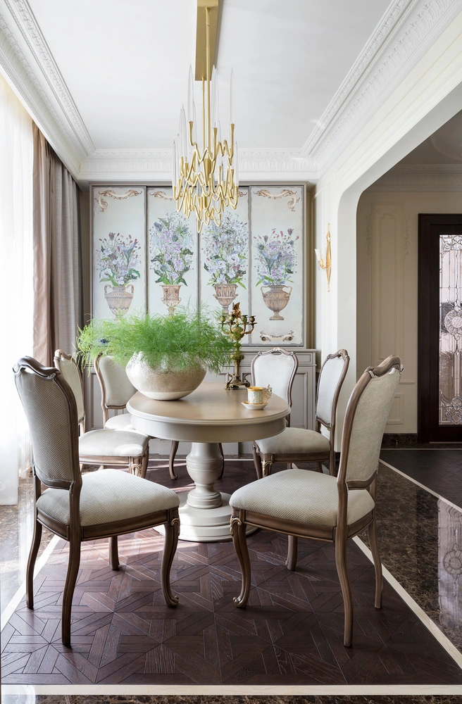 «Основной задачей стала перепланировка. Нам предстояло объединить две квартиры и организовать восемь комнат, три санузла, гардеробную и хозяйственную зону. Гостиная, кухня и столовая обязательно должны были располагаться рядом. Также нам было важно найти место для отдельного кабинета с фортепиано, на котором учится играть внук».