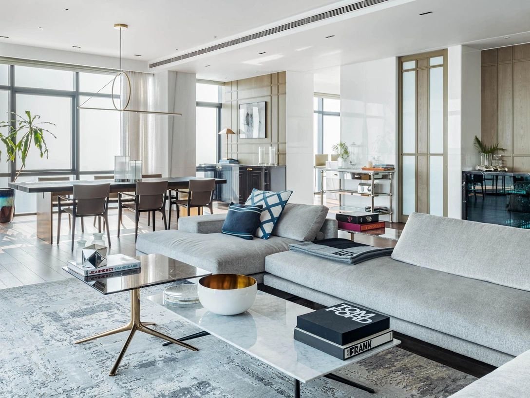 Увлечение заказчика игрой в поло повлияло на выбор предметов искусства — многие произведения связаны с конным спортом, включая работу Саши Джафри, которую клиент приобрел на аукционе. Планировка продумана так, чтобы предоставить 360-градусный обзор на город, который открывается из панорамных окон с 38 этажа. «Мы работали с брендами, которые отражают дух времени, такими как Poliform, B&B Italia, Poltrona Frau и Flos», — рассказывает Вадхвани.
