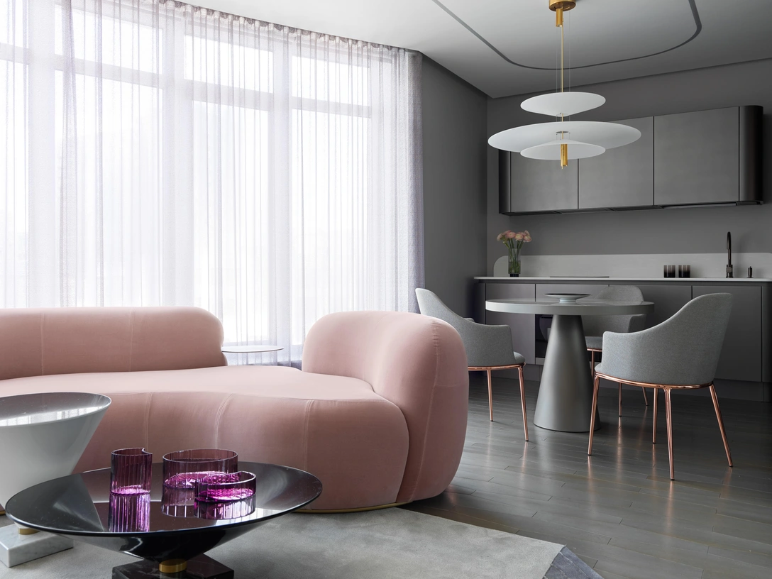 В каждом помещении есть «главный герой». В гостиной это, несомненно, розовый диван актуальной скругленной формы со встроенными латунными столиками. Это первое, что бросается в глаза при входе в комнату — он словно приглашает присесть, полистать модные журналы и пообщаться с хозяйкой дома.