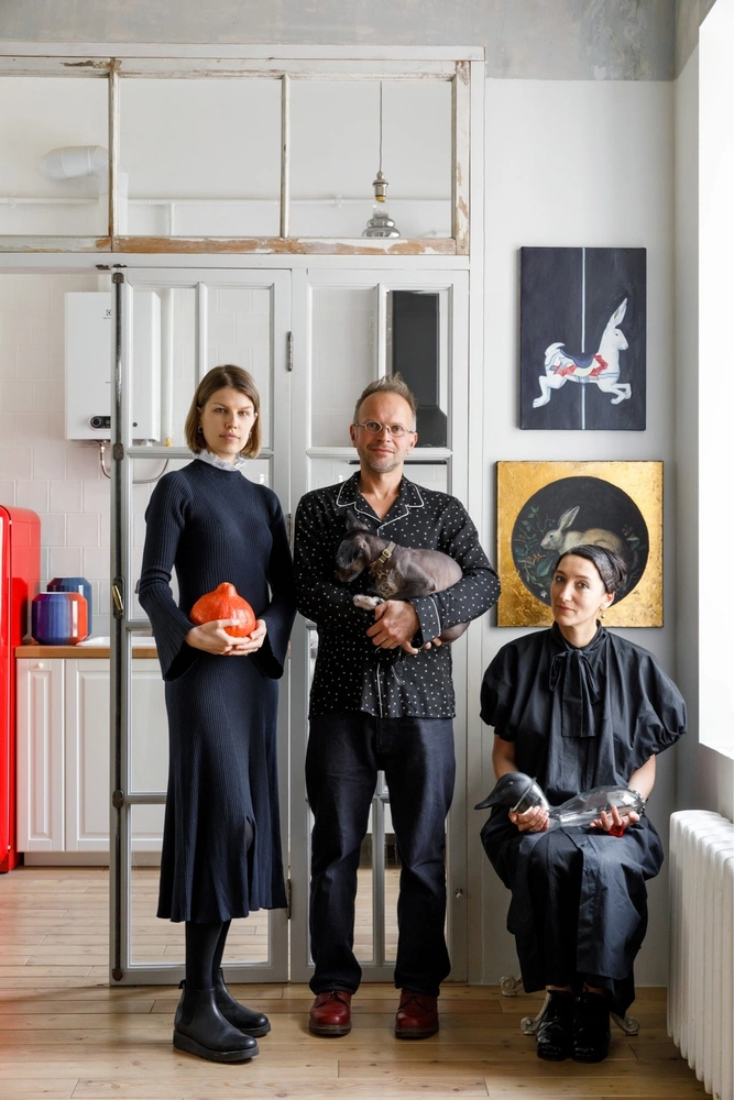 Квартиру в старом петербургском доме художница Наталья Пивко и скульптор Денис Прасолов купили с целью превратить ее в рабочую студию. Местоположение, северный свет и высокие потолки — все подходило идеально. Впрочем, о высоте потолков знали только из документов. «Едва получив ключи, мы вооружились привязанным к швабре ножом и принялись разрезать натяжные виниловые потолки, — вспоминают владельцы. — Наконец увидели высокий потолок, покрытый слоями побелки разных цветов, от белого до яркой синьки, которую пришлось размывать, чтобы проступила лепнина».