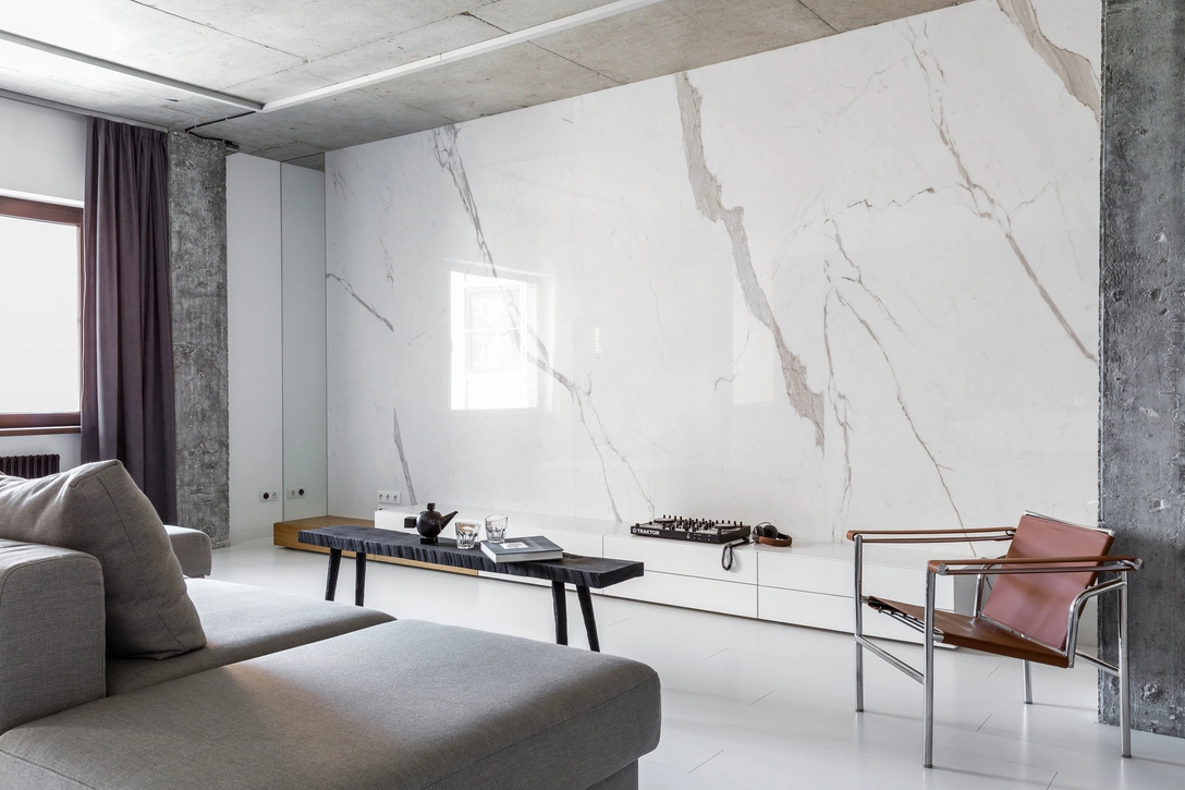«Глянцевый мрамор на стене в гостиной сочетается с рельефной структурой бетонной колонны. Цветовым акцентом интерьера стал большой книжный стеллаж из дуба. Его теплый оттенок и мягкая фактура древесины разбавляют брутальность и строгость дизайна квартиры».