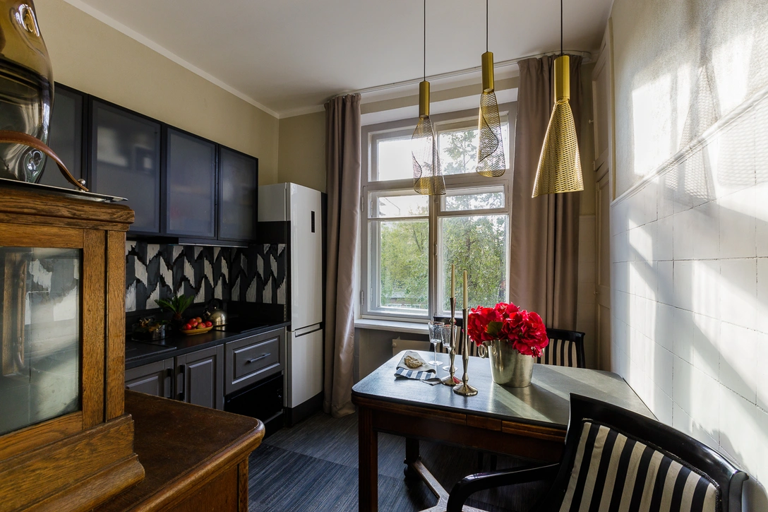 Эта квартира имеет богатую историю, память о которой мы непременно хотели сохранить. Именно здесь происходят действия книги «Похороните меня за плинтусом», написанной моим мужем, писателем и режиссером Павлом Санаевым. Будучи ребенком, он жил в этой квартире со своими бабушкой и дедушкой. Атмосфера в доме была довольно напряженной, поэтому, когда нам пришла пора отправлять дочку в первый класс, и мы размышляли, куда переехать из загородного дома, муж не сразу согласился выбрать эту квартиру. Павел боялся, что она будет напоминать ему безрадостное детство.