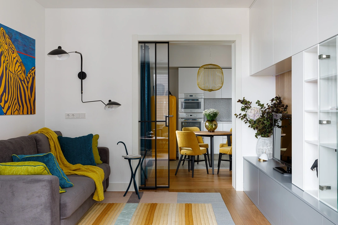 «Что касается планировки, главным пожеланием было изолировать кухню, при этом обеспечить ее плавное перетекание в зону гостиной и видимость объединенного пространства. Эту задачу помогла решить раздвижная перегородка с прозрачным стеклом и рамами из черного металла».