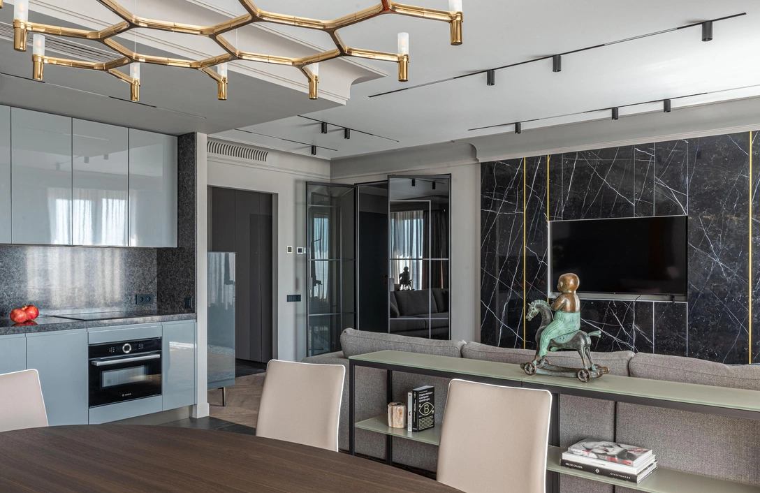 «Проект называется „Жизнь на высоте“, потому что квартира расположена на 29-м этаже, — рассказывает дизайнер Анна Германова-Подольская. — Клиентке было важно, чтобы интерьер, в котором она решила объединить классический и современный стили, выглядел изящно и был timeless, то есть вневременным. Исходя из этих соображений, мы старались делать акцент на натуральных материалах, которые красиво „стареют“. Искусственный камень у нас присутствует только на столешнице кухни — это решение оказалось довольно функциональным».