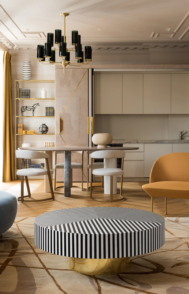 Предыдущая квартира заказчиков была выполнена в светлой гамме, с белыми стенами и деликатными переходами цвета, но в новом пространстве им захотелось добавить больше цветных акцентов. Интерьер не перегружен мебелью, но за счет использования крупных принтов, светильников необычной формы, разных видов мрамора и дерева выглядит объемно и не скучно.