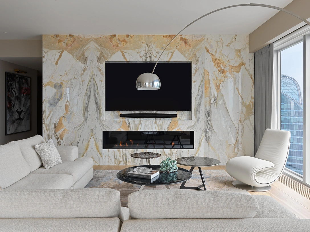 «Из панорамных окон квартиры открывается вид на всю Москву, и кажется, будто ты находишься где-то на вершине горы и вот-вот коснешься облаков. Это ощущение вдохновило меня сделать акцент на природные материалы, такие как камень и дерево. Мрамором Calacata Gold облицован биокамин, который так хотела Марго, и кухонный остров и фартук. Тот же материал мы использовали для оформления несущей колонны, которую украшают светильники, выполненные по моим эскизам на фабрике MM Lampadari. Обеденный стол Magma от Fiam из бирюзового стекла идеально вписался в монохромный интерьер. Мне он напоминает горное озеро».