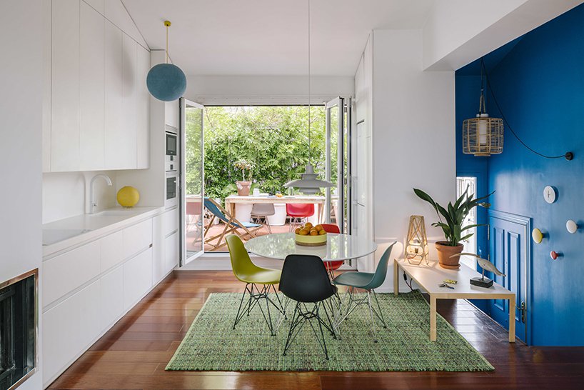Следуя запросам заказчика, архитекторы сделали пространство максимально просторным, светлым и открытым и по минимуму использовали перегородки, практически стерев границы между комнатами. Гостиная здесь плавно перетекает в кухню, а кухня в открытую зеленую террасу.