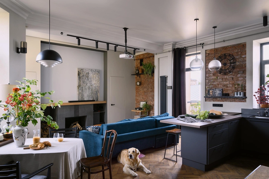 «Из кухни-гостиной в спальню ведут высокие двойные двери — одни из тех, что нам удалось сохранить в этой квартире. Также мы восстановили паркет начала XX века и мраморный каминный портал, который идеально вписался в интерьер кабинета. Большинство кирпичных несущих стен не стали отделывать штукатуркой, а просто очистили и покрыли прозрачным матовым лаком».