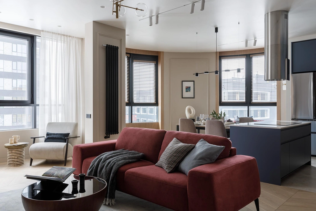 «Проект разрабатывался для молодой пары с ребенком. Прежде всего заказчики попросили создать комфортное пространство для приема гостей и семейных вечеров, а также уделить особое внимание организации хранения — все шкафы и технические помещения нужно было сделать максимально незаметными», — рассказывает дизайнер Анастасия Чернышева.
