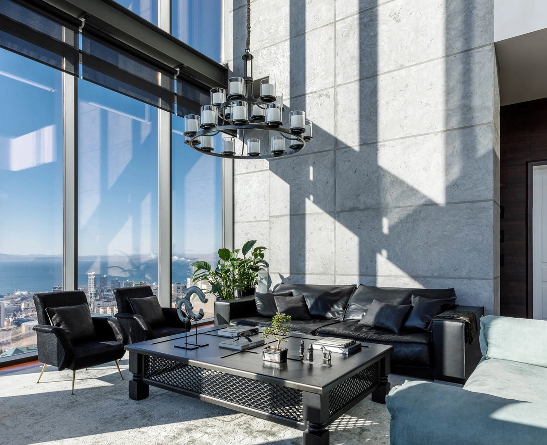 Из окон этой квартиры открывается захватывающий вид на бухту Золотой Рог и Амурский Залив. Благодаря панорамному остеклению, пространство апартаментов наполняется естественным светом. Владивосток занимает первое место среди городов России по количеству солнечных дней в году, поэтому такое решение более чем оправдано. Каркасы окон отбрасывают тени на поверхность стен, создавая рисунок в духе конструктивизма.