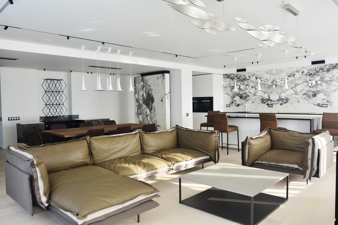 «Мы понимали, что до подбора предметов искусства можем и не добраться, — продолжают авторы проекта. — Поэтому решили наполнить интерьер „абстрактными полотнами“ из натурального камня. В гостиной это итальянский мрамор Breccia Capraiа. Камень имеет характерный графический рисунок. Если смотреть издалека, то это невероятной красоты монохромный рисунок, вблизи — спокойная мягкая живопись различных цветов, в которой практически нет серого цвета и есть множество сложных оттенков зеленого, фиолетового и охристого. Не менее интересна отделка из вулканического камня туликиви в прихожей, в комнате старшей девочки — панели из дерева сукупира, изумительной выделки кожа на кровати Alivar и диване Arketipo, ткани на кроватях в детских Ivano Redaelli и мягкая алькантара на диванах Ligne Roset в детских».