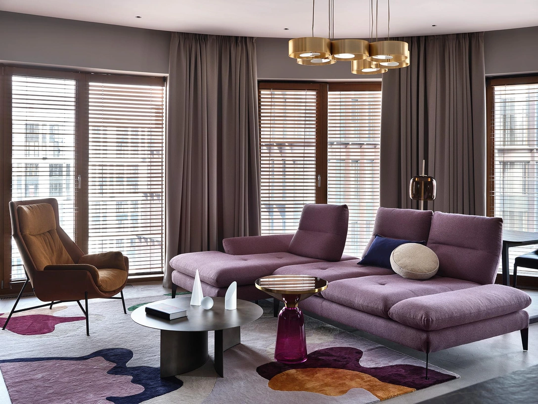Квартира расположена в угловой части здания с закругленной стеной в гостиной. Полезных стен там мало, но много больших панорамных окон. Несмотря на это в комнате удалось разместить просторную кухню с обеденной зоной.
