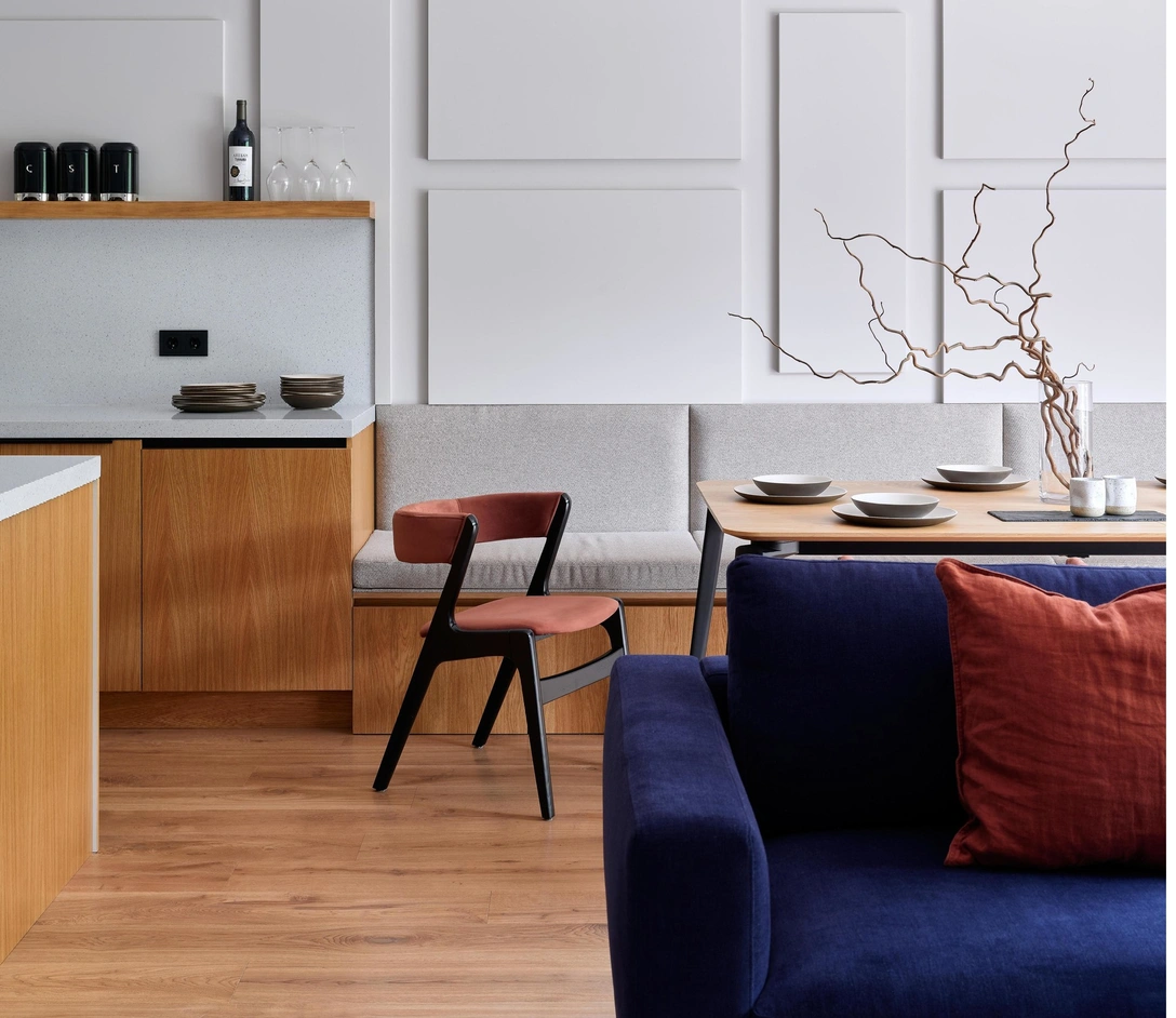 В кухне-гостиной, где вечером собирается семья, где обсуждаются все планы и события, где происходят встречи с друзьями самым интересным предметом стал диванчик в обеденной зоне.